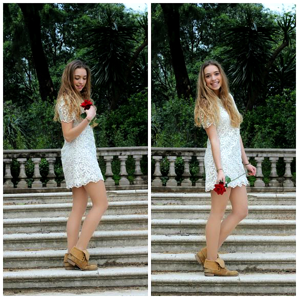 Tot i que, si, molta primavera, molta flor i molt de pètal, pero aqests 10 graus ens diuen que no ens precipitem, que el sol encara és tímid i que encara queda molt per ploure. La veritat és que em costa desenganxar-me de la «primeta però calorosa» parca i del seu aire despreocupat. I què millor que combinar-la amb un vestit blanc, per la dolçor «romanticona» que inspira, perfecte per rebre aquesta llum tenue i encara freda que ens porta les primeres vibracions de l’estiu; i els botins, sempre a punt per salvar-nos de qualsevol ocasió.