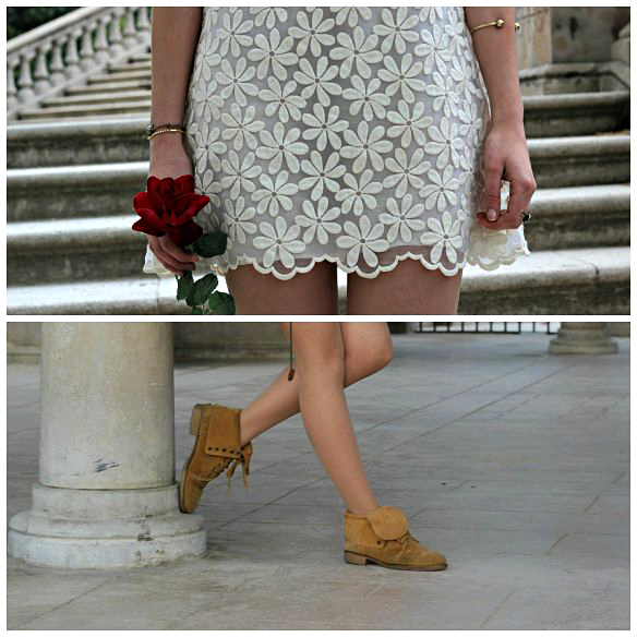 Aunque, sí, mucha primavera, mucha flor y mucho pétalo, pero esos 10 grados nos dicen que no nos precipitemos, que el sol es aún «timidillo» y que aún queda mucho por llover. La verdad es que me cuesta despegarme de la «delgadita aunque calurosa» parca y de su aire despreocupado. Y qué mejor que combinarla con un vestido blanco, por la dulzura romanticona que inspira, perfecto para recibir esa luz tenue y aún fría que nos trae las primeras vibraciones de verano; y los botines de ante, siempre a punto para salvarnos en cualquier ocasión.