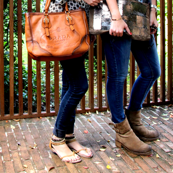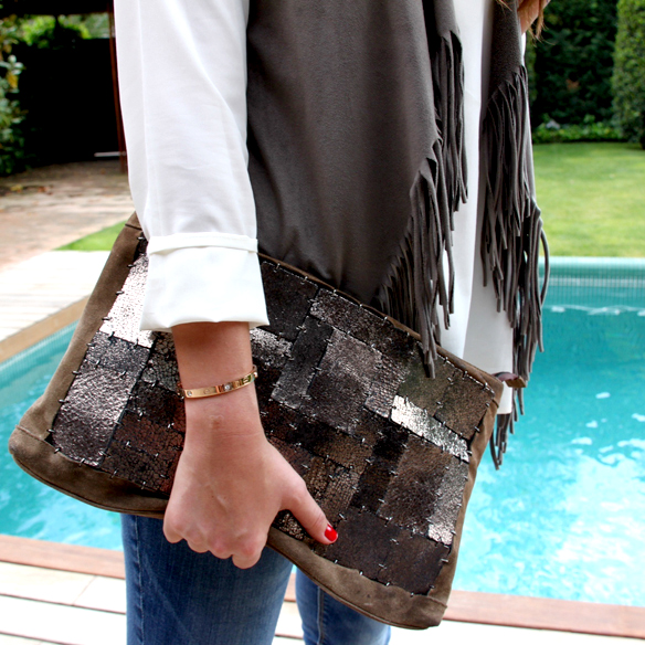 Meanwhile, Andrea has also opted for jeans (she can’t miss them in her closet neither), a white shirt and a tassel vest. Tassels reappear this summer giving the outfit a more boho style. She combines it with ankle boots, red nail polish and a handbag with metalized patches. How you already might know, metalic accessories are a SS 13 must-have.