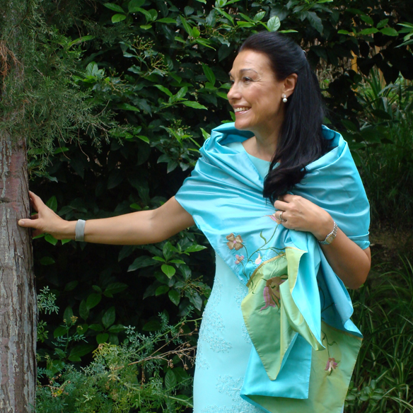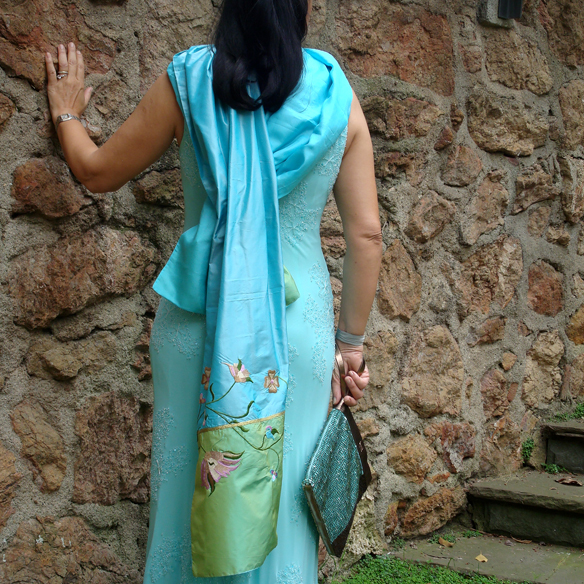 Si la noche es fresquita, me pongo un chal. Este es de Tailandia, de raso del mismo color, con flores bordadas en las puntas. Es muy especial y me gusta porque tiene un estampado floral oriental must-have esta temporada. Sin duda el chal es el toque divertido para mi look de boda.