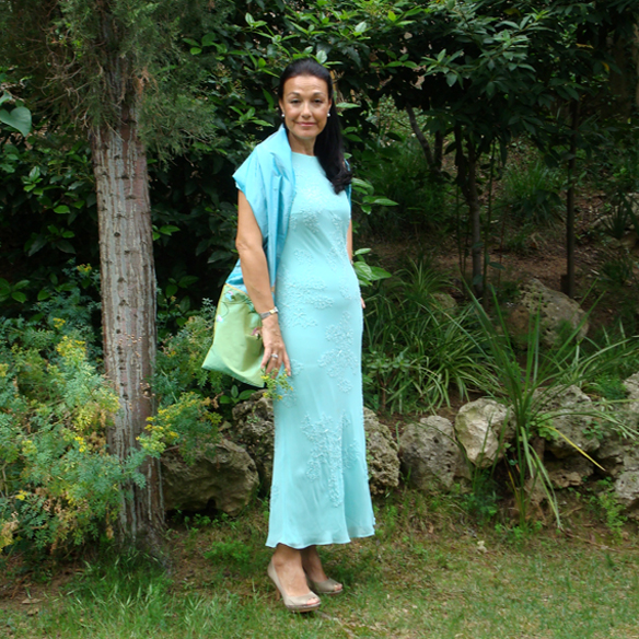 És un dia de conte de fades, un casament sempre és un dia especial. Per a aquesta ocasió, el meu color serà el aiguamarina pastís, un dels colors estel del l’estiu. Porto un vestit de tall al biaix, a l’alçada del turmell, i cenyit al cos, fet de gasa sobre ras amb aplicacions de pedreria a to. El aiguamarina és el color del mediterrani i afavoreix a les brunes. M’agrada el detall de l’esquena a l’aire per lluir bronzejat. Les sabates són uns peeptoes clàssics en color nude, que combina bé tant amb els colors pastís com amb els colors atrevits, amb una discreta plataforma de brillantina.