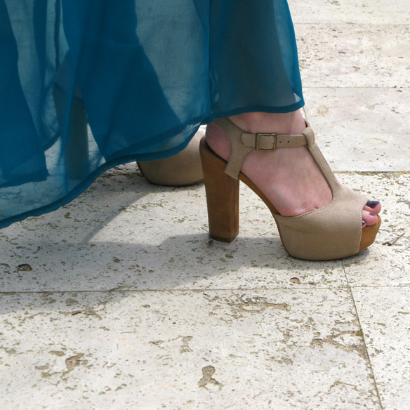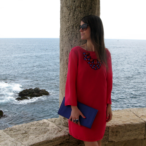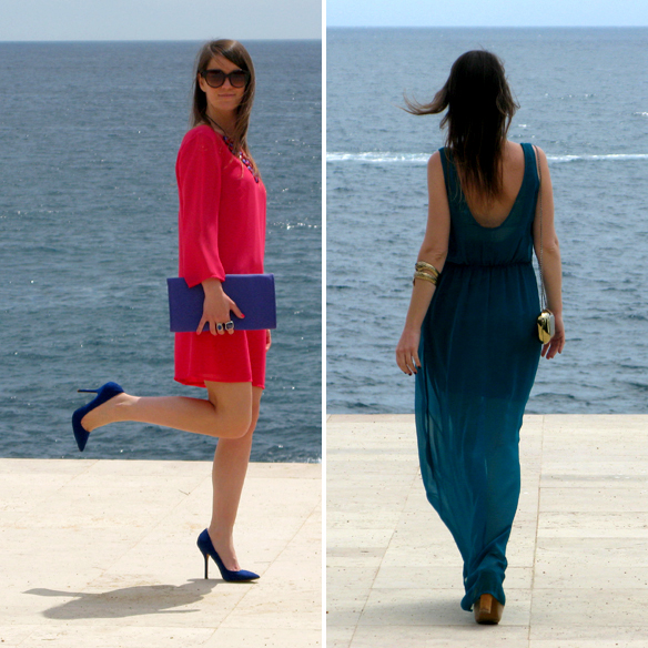 For the day wedding, I chose a daring look with a fuchsia short dress with open back and matching nails, combined with clutch and stilettos in klein blue. And as they say, opposites attract, and both the bib necklace and the total look are the proof that it’s true. And yes, the bad thing of short dresses are the white legs we have in May. I’m not a fan of tights because I find them uncomfortable, either of the self-tanning creams that smell strange and give your skin a yellow tone, neither U.V.A., but a little advice, if you see that your feet are still «hibernating» bet for pointy toe stilettos.