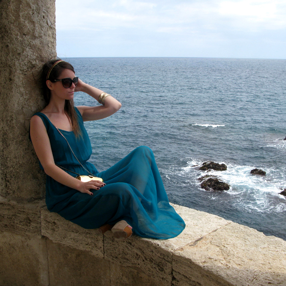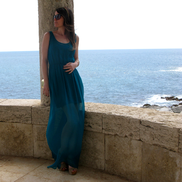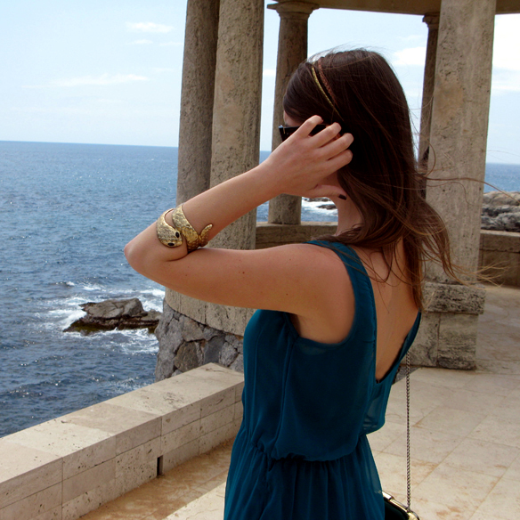 Instead, for the evening wedding, the legs problem is solved with a long dress. This one, more classic than the previous one, is peacock green color, and I combined it with aubergine nails, golden clutch, bracelet and hairbands, and beige sandals. It is a very simple dress, but having a double layer of fabric, makes it semi-transparent from thigh downward and reveals the figure of the legs.
