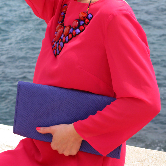 Para la boda de mañana, escogí un look más atrevido con un vestido corto color fucsia con la espalda al aire y uñas a juego, combinado con clutch y stilettos en color azul klein. Y es que como bien dicen muchos, los contrarios se atraen, y tanto en el collar babero que llevo, como en el total look, está la prueba de que es cierto. Y sí, lo malo de los vestidos cortos son las piernas tan blancas que tenemos en Mayo. No soy muy fanática de las medias porque las encuentro incómodas, tampoco de las cremas autobronceadoras que huelen raro y te dejan un tono amarillo, ni de los rayos U.V.A., pero un pequeño consejo, si veis que vuestros pies todavía siguen «hibernando», apostad por unos stilettos de punta afilada.