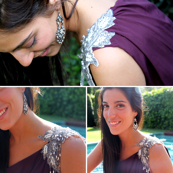 Carlota has chosen a Greco-Roman style dress. A plum silk dress, strapless subject on a single shoulder and leg opening. We love this kind of asymmetrical dresses that make you look ultra feminine! She has combined them with grey high peeptoes.