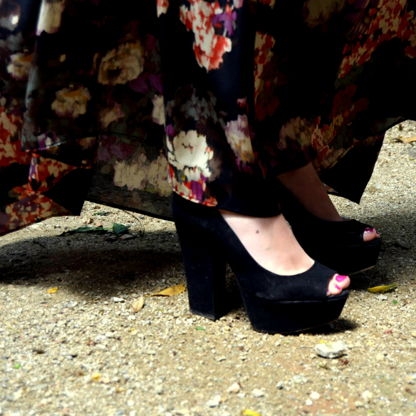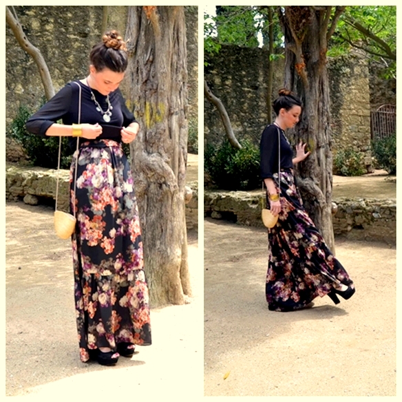 He combinado la maxi falda con una blusa negra con mangas y espalda de seda traslucidas, además de unos tacones negros con plataforma delantera. En cuanto a los complementos, tan solo he escogido un brazalete dorado y un collar de monedas plateadas ya que, ¡hoy la falda es la protagonista! Un outfit fácil, elegante y súper cómodo, al que también se le puede añadir una original corona de flores para darle un toque alegre al conjunto. ¡¡¡Nada más divertido que una fantástica boda en el campo!!!