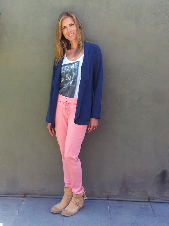 Me gusta ir cómoda para mi vida cotidiana. He salido de casa muy pronto para llevar a las niñas al cole y después corriendo he tenido que coger un taxi para ir a una sesión de fotos en Montjuïc para la revista Telva. ¡Por fin hace buen tiempo y brilla el sol en Barcelona! Así es que esta mañana medio dormida me he puesto bota plana para ir cómoda, pantalón rosa de algodón muy fresquito y primaveral con una camiseta que pone: «Welcome to sun city» de Guess (¡hoy era el día ideal!). Y la chaqueta muy informal, que me encanta y me va bien siempre con todo, de Yerse. Soy práctica y necesito ir vestida para todas las ocasiones del día a día. Evidentemente para la sesión de fotos ya me esperaba una estilista que me ha puesto un vestido de Bottega Veneta y unos zapatos de tacón maravillosos. Y es por eso que siempre busco el contraste en la comodidad para mi día a día.