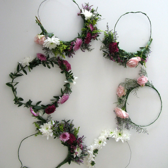 Otra opción es hacer coronas de un solo tipo de flor, más sencillas y a la vez muy femeninas. Esta opción es menos complicada: en lugar de hacer la corona con el doble alambre, con una tira de hilo de nuestra medida «pincharemos» la flor de modo que el alambre la atraviese por la parte más superior del tallo y cortaremos la parte sobrante. Repetiremos el proceso hasta llenar el hilo formando una diadema. También podemos usar cintas en la parte final del alambre para poder atarla o simplemente cerrarla con el propio alambre formando una corona.