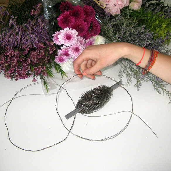 At first, we are going to measure our head with the florist wire because it is easier to handle andto cut. Once we have the ideal length we will do two turns of wire to give more consistence to the structure.