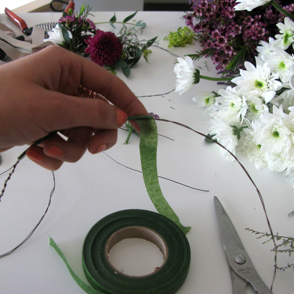 Quan tinguem la corona de la nostra mida recobrirem el fil metàl·lic amb la cinta adhesiva vegetal de color verd, que és ideal per a que no espatlli la flor i per dissimular el fil metàl·lic.