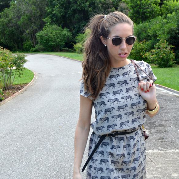 Para la verbena de San Juan os propongo este vestido corto de DOLORES PROMESAS con estampado animal print que he combinado con un cinturón negro y unos zapatos negros de salón con la punta dorada. Para los complementos he escogido tonos dorados (pulsera y anillo) y marrones (bolso) y para las uñas el esmalte “BIG APPLE RED” de OPI que es uno de mis preferidos.