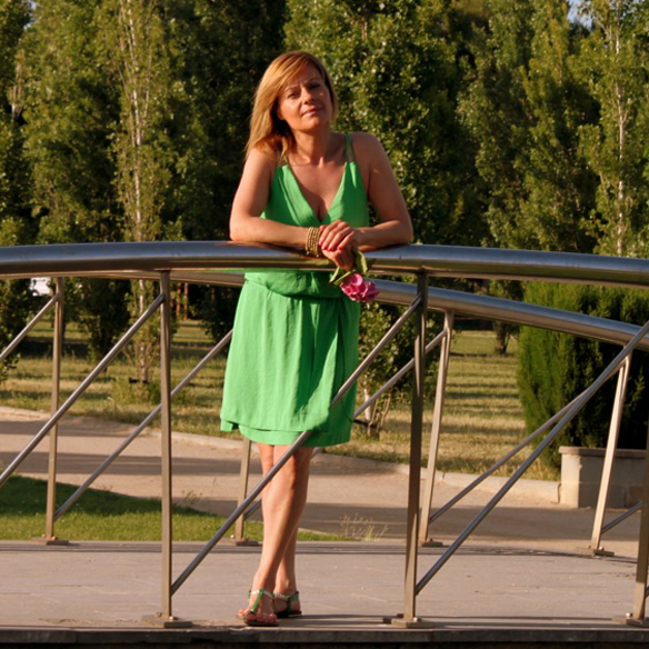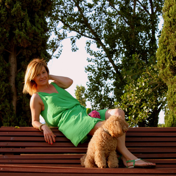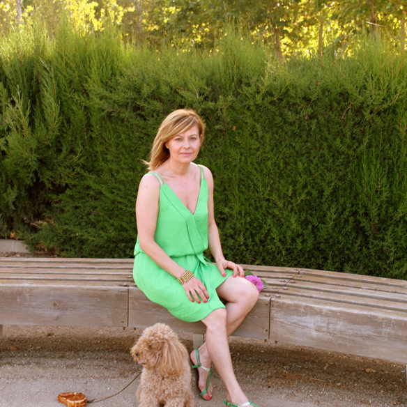 For this occasion I chose this green dress, my favorite color. It is comfortable, fresh, happy and matches perfectly with green and gold sandals. In addition I am wearing an old gold bracelet as accesory. Futhermore, I present the baby of the family, an apricot color toy poodle, «Bebo», that wanted to be a hanging too!