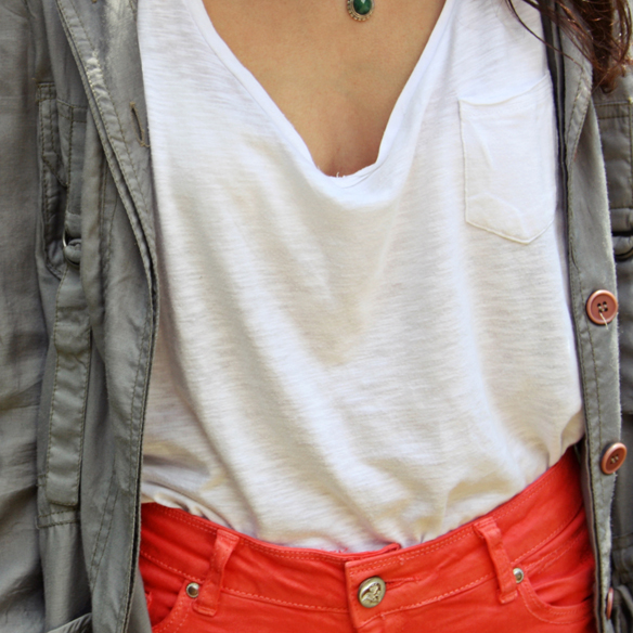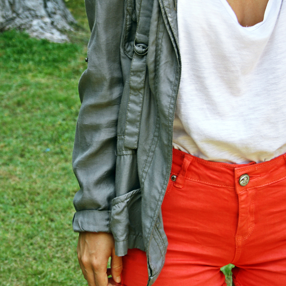 Summer has arrived!! I was expecting it!! And it’s the perfect moment to start pulling out of the closet all your shorts, and this is why I have opted for a totally summer-like look. I have decided to put neon orange color shorts, because neon colors are now very trendy! In addition, they are high-waisted shorts, which lets to put the t-shirts inside the pants. I have chosen a very basic white t-shirt, to leave the importance to the shorts and a grey or kaki trench, depending on the light, to accompany fresh moments. Besides, I opted for black Victoria with very comfortable platform to walk through the city. Now that summer comes and everyone goes on holiday, this look is highly recommended and very comfortable to walk, walk and don’t stop walking wherever you go.