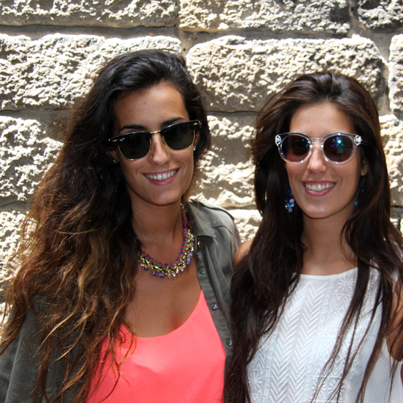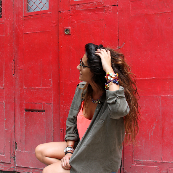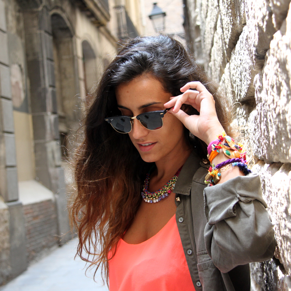 July begins and we need holidays!!! After having a great lunch at Barcelona downtown we decided to take a walk :) The best choice for us in this summer days are shorts and basic t-shirts. Carlota has chosen high-waisted shorts with a basic t-shirt and baby blue Victoria. Andrea has opted for a neon coral t-shirt, green army jacket with gold skull buttons and broken shorts. On the feet… rhinestones!