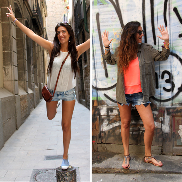 ¡¡¡Empieza Julio y tenemos ganas de empezar las vacaciones!!! Después de comer por el casco antiguo de Barcelona dimos un paseo por esta preciosa ciudad :) En estos días de verano la mejor elección para nosotras son shorts y camisetas básicas. Carlota ha elegido unos shorts de tiro alto con camiseta básica y bambas Victoria azul bebé. Andrea se ha decantado por una camiseta coral neón, camisa verde militar con botones de calaveras dorados y shorts rotos. En los pies… ¡pedrería!