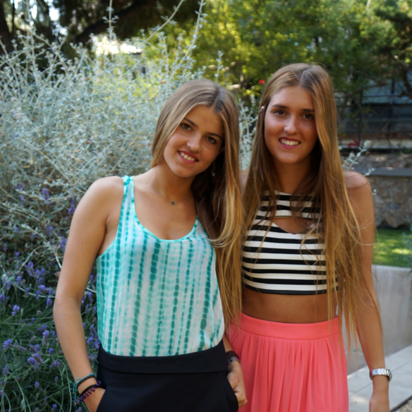 Today’s post is a little bit different because today we present Julieta, Carlota’s sister, instead of Ana, because she couldn’t make it this time. We, the Gracia sisters, have chosen a summer look. Julieta has chosen a short-skirt which you can wear during the day or night combining it with a tie-dye t-shirt. She’s chosen a pair of spike boots to break the look. On the other hand, Carlota has chosen a maxi skirt with side openings with a sailor top and trainers to make it a bit street style.