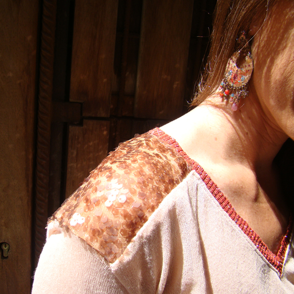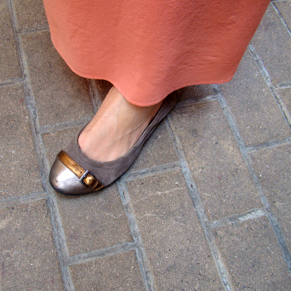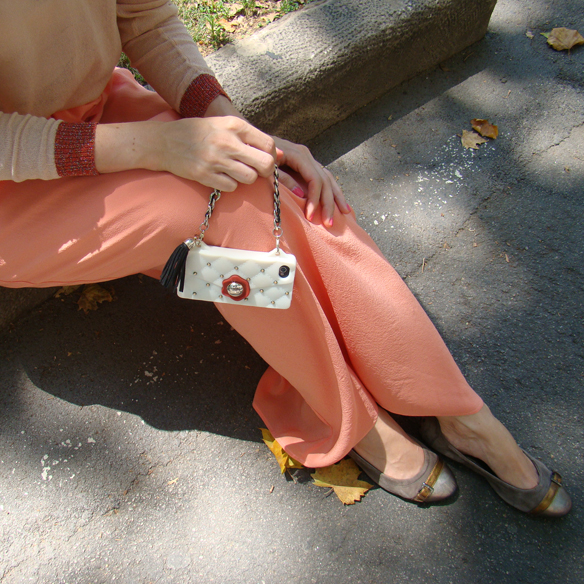 My today look is the last one of the summer but I wear clothes from next summer. In color terms the orange clothes will substitute the trendy yellow ones from this summer. For that reason, and because I like to wear the new trends before no one, today I am wearing an orange maxi skirt with a thin sweater from next SS 14 Nell&Me Collezione. As a counterpoint I wear a strawberry margarita nail polish and brown paillettes.