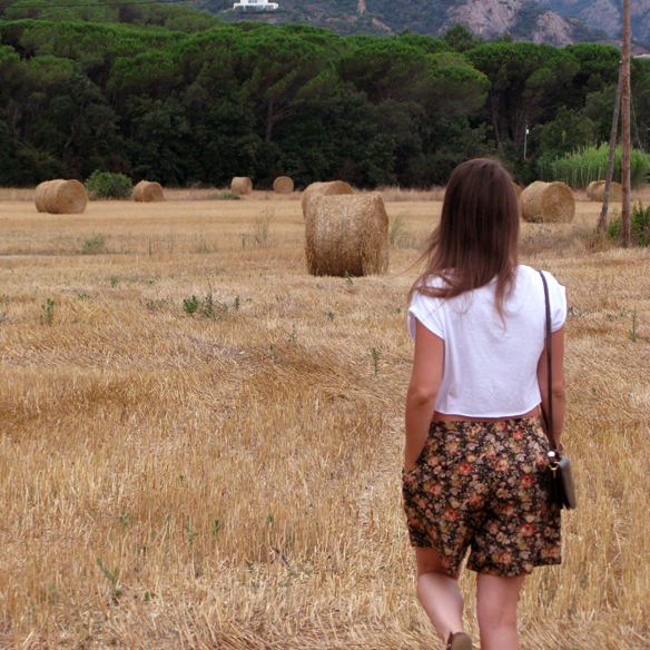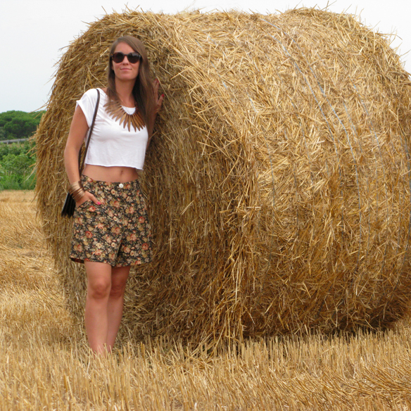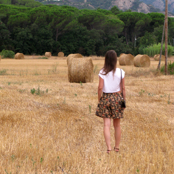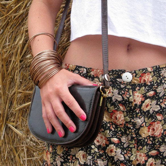 Me encanta la gradación de colores dorado, bronce, madera y marrón. Cuando pienso en ellos pienso en el campo, las hojas, la puesta de sol, caballos salvajes galopando… Son colores que me hacen sentir cerca del otoño, pero combinados con el blanco del crop top, los floral shorts, y mis sandalias preferidas, me aferro a estos últimos días de calor antes de dar el paso.