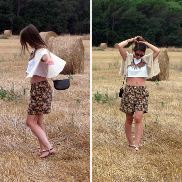 I love the gradation of colors gold, bronze, wood and brown. When I think of them I think of the field, falling leaves, the sunset, wild horses galloping… They are colors that make me feel closer to the fall, but combined with the white crop top, the floral shorts, and my favorite sandals, I cling to these last days of good weather before taking the first step.