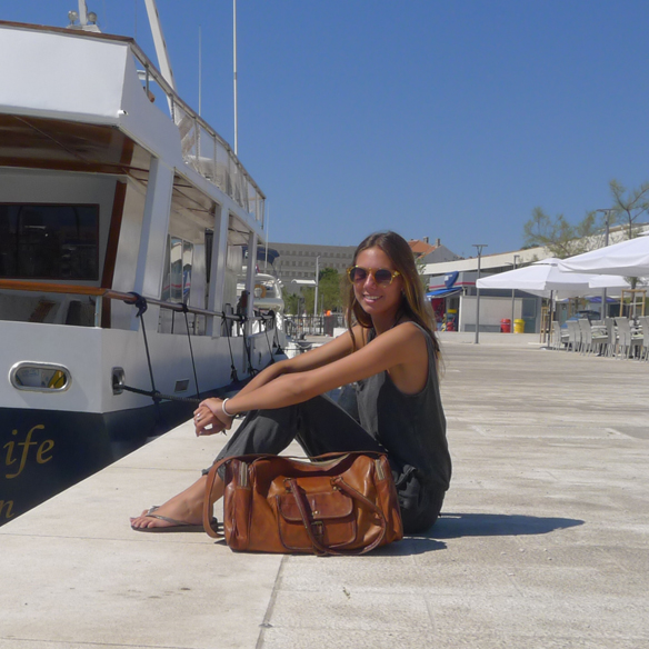I introduce you my dearest sister Inés. I took this picture in Split (Croatia) before going to the airport back to Barcelona after a week of relaxation, sun and sea on a beautiful schooner, the schooner Angelica. She is wearing a ZARA jumpsuit, Havaianas flip-flops, KOMONO champagne color sunglasses and an Indian bazaar handbag.