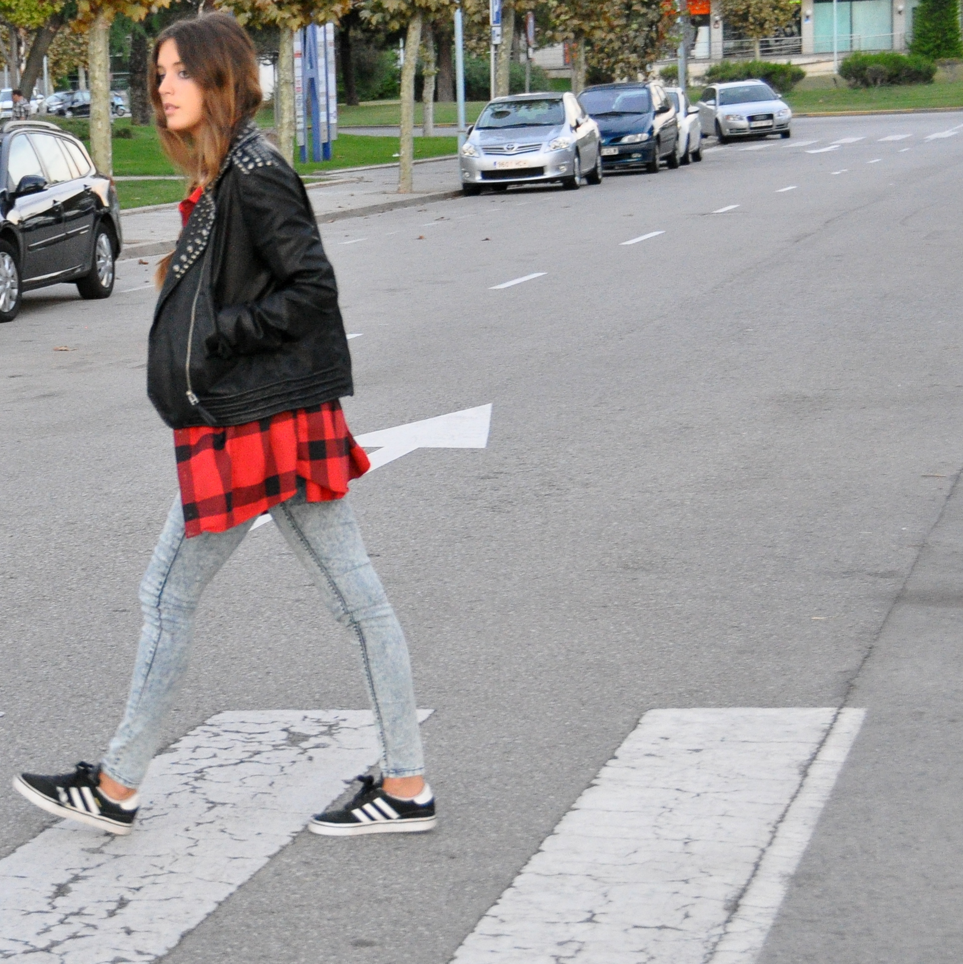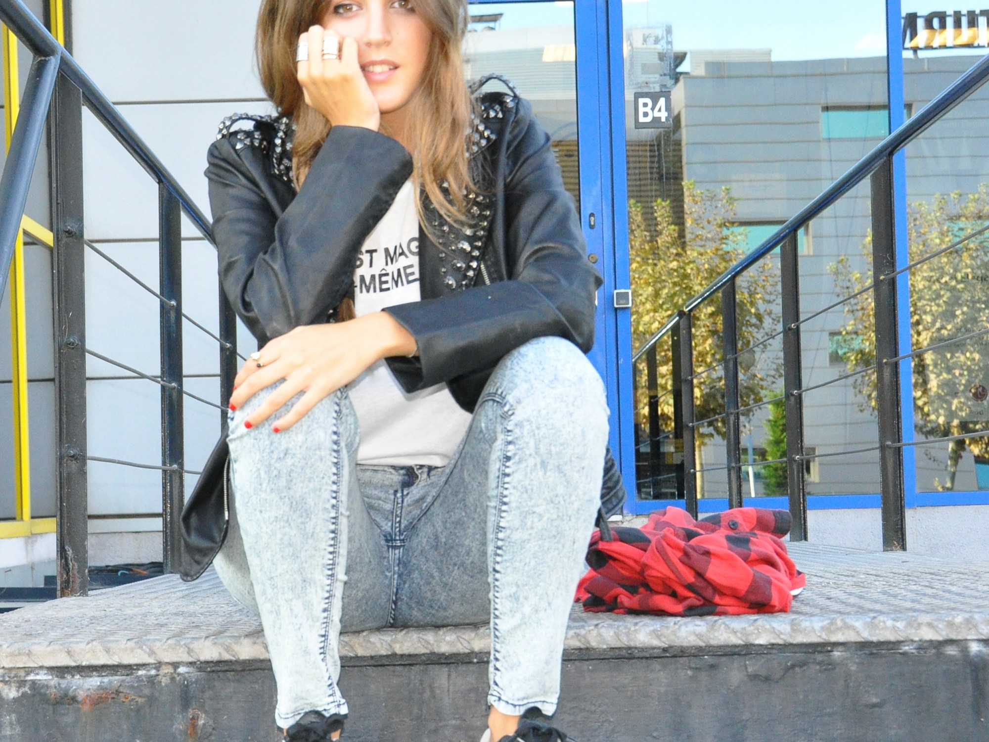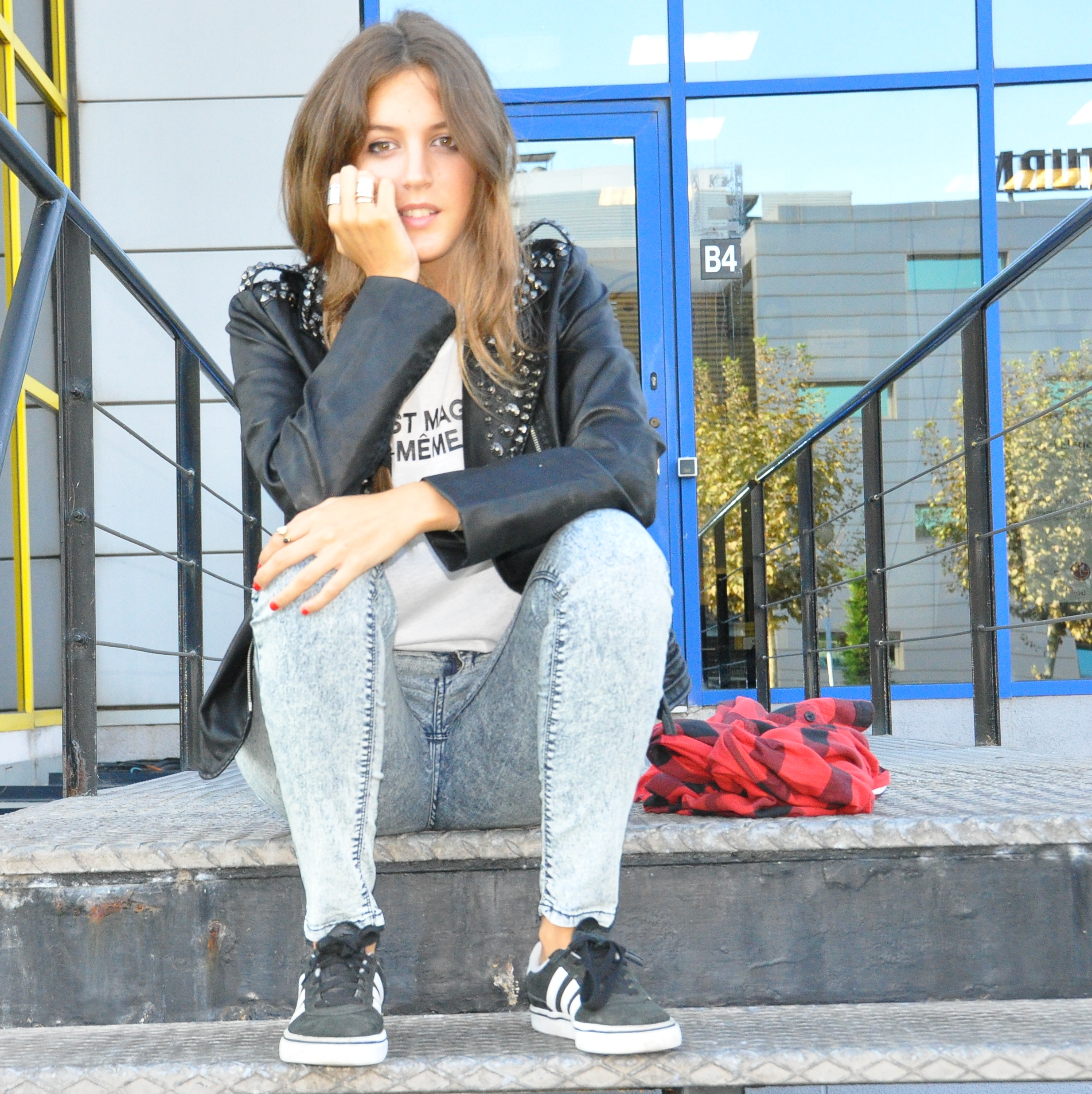 This season grunge stomps with carefree and informal looks. My basics every Winter are XL shirts and jumpers, jeans… So I’m lucky! Today’s shirt is my favorite of all that I have, the plaids are with no doubt a must-have, comfortable skinny jeans, the classic Adidas and a jacket for warmer Winter days, with the details of studs that I love. But I would certainly stand out from all the look the message on my t-shirt: «La vie est magnifique sois toi-même» (Life is beautiful be yourself). Message garments are another FW 13/14 trend that gives roll and personality to the outfits, it is another way to transmit.