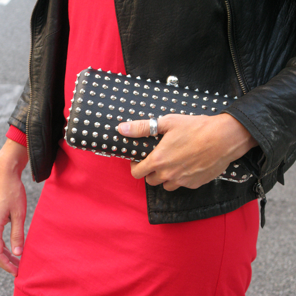 I start my journey in this blog with a quite resounding look. As you know red is trend this FW, but it’s not an easy color to wear because you can easily fall into vulgarity. This dress is sexy but in perspective, it has no low neckline and it’s not excessively tight, and combined with leather clothes and accessories with studs, gives the look an air of glam rock that makes it ideal for a night out. Hope you like it!
