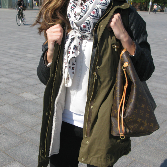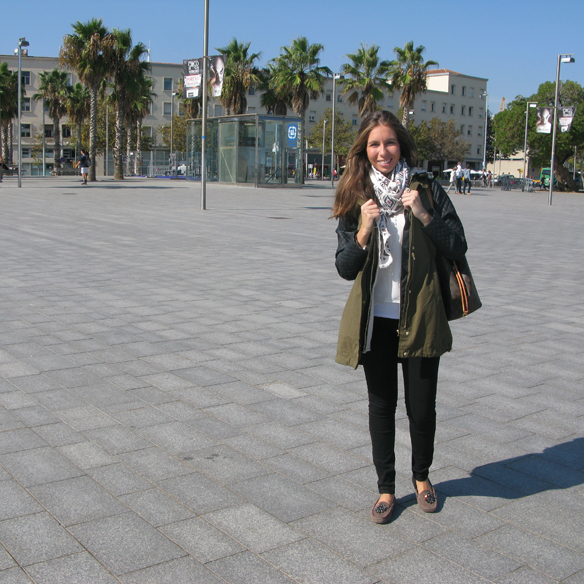 Este look me lo puse el domingo para ir a comer por la Barceloneta con mis amigas. Quería ir cómoda así que me puse unos pantalones negros básicos, una camisa blanca, unos mocasines y, como estos últimos días ha hecho un poco de frío y yo soy muy friolera, estrené mi nueva parka militar que al estar forrada por dentro abriga muchísimo y es muy calentita. Del look de hoy destacaría el detalle de los botones de la camisa, la pedrería de los mocasines, el foulard étnico y las diferentes texturas de la parka.