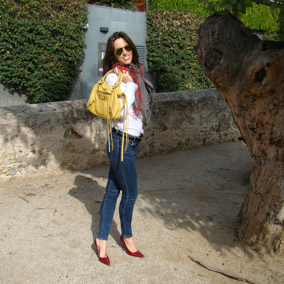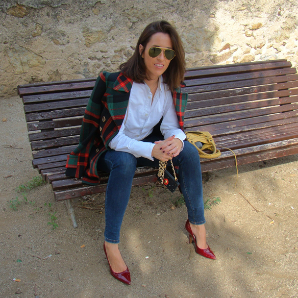 Tartan (or what is the same, the Scottish style), is the trendiest print this season. Tartan never goes out of style and, for that reason, it’s a great idea to spend in clothes and accessories of Scottish print. Personally I love this print because instead of other prints that make you look older, the tartan print is very colourful and easy to wear. However, you must be careful if you don’t want to seem a traffic light… Besides that, today I wear a tartan coat, with a white Oxford shirt (very trendy this season), blue skinny jeans (I can’t live without them), and colourful stilettos and bag.