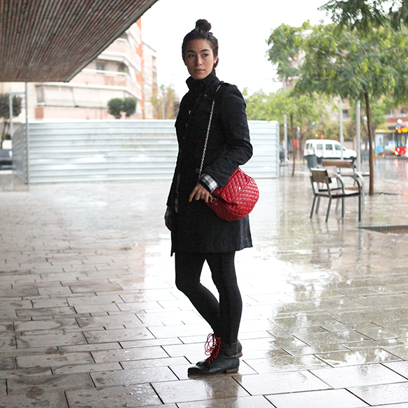 To start my phase in this blog I chose an informal look, which also is very simple and is one of my favorites. XL plaid shirt which gives a casual touch, with a white t-shirt, and side fringed leggings. It’s usual to wear dark colors in Winter, and more in rainy days at least that’s what happens to me. But to try not to wear all black clothes I decided to change my old boot’s laces and give them a different style to get them out of boredom! And I did it with the season’s must-have color: red. To finish this look, the coat is dark too, so I chose a bag in the same color as the laces so they can stand out equally and give a different note and color to the look!