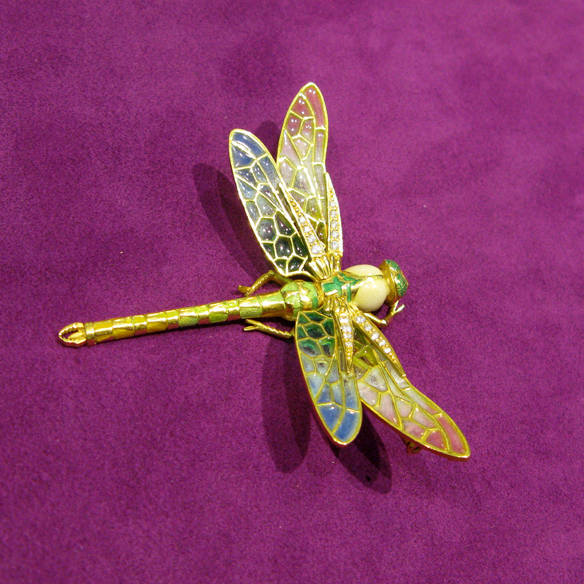 Queremos hacer una mención especial a este broche modernista en forma de libélula, hecho de oro amarillo y esmalte, por el trabajo artesanal que representa. Sara Benages, esmaltadora del equipo de BLU Barcelona, nos contó la técnica milenaria del esmaltado en fuego. Polvo de vidrio muy fino de muchos colores, se limpia con ácidos para liberarlo de las impurezas y se utiliza en forma de solución acuosa cómo una «pintura» que al cocerse a 800ºC muy lentamente se vitrifica por capas. En función de las capas se consigue que sea más o menos translúcido. Todo una obra de arte.