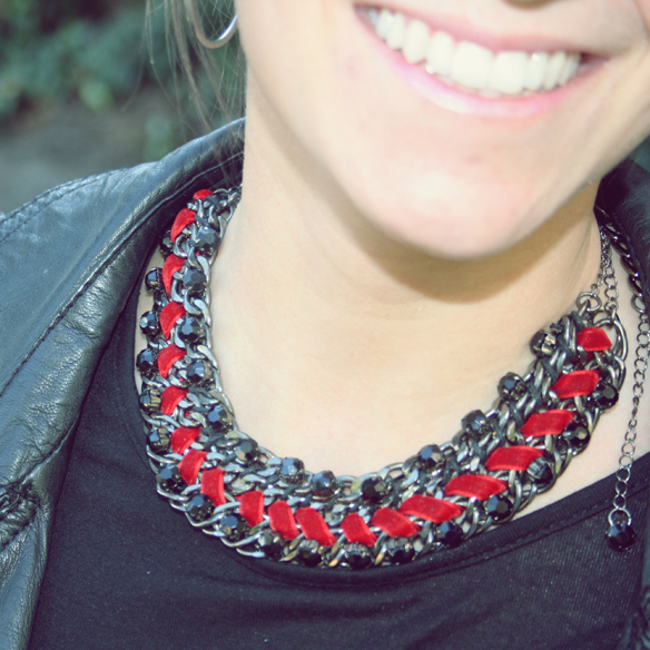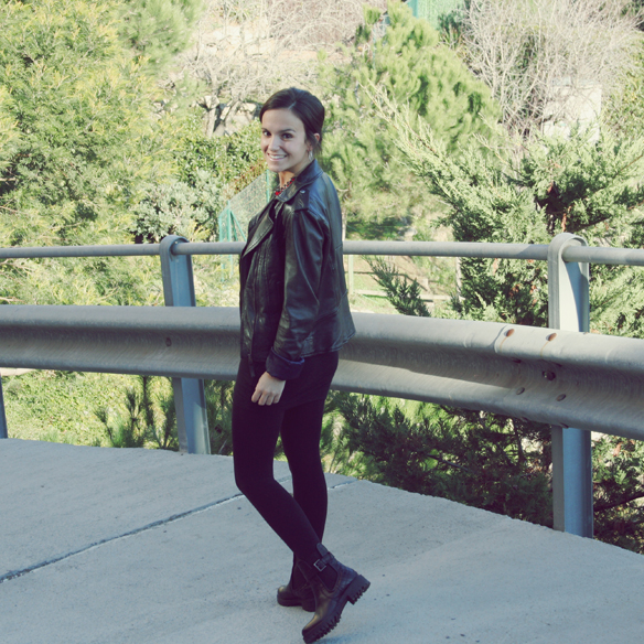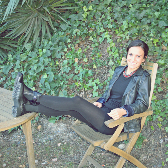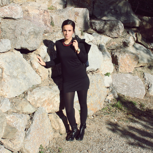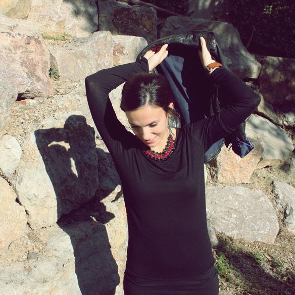 Cuanto menos, mejor. Y sí, el negro es siempre la opción segura. Me gusta el negro. Me parece elegante. Por eso, en Navidad he escogido un vestido ceñido negro (LBD), con unos botines negros de piel que dan un toque de rock y una cazadora de piel. Me parece que es una buena forma de ir elegante, juvenil y cómoda. No soy muy partidaria de los zapatos de tacón; sólo para días muy especiales, pero en Navidad me gusta ir cómoda para poder disfrutar del día. Además, me he decidido por este collar que le da un toque de color al outfit.
