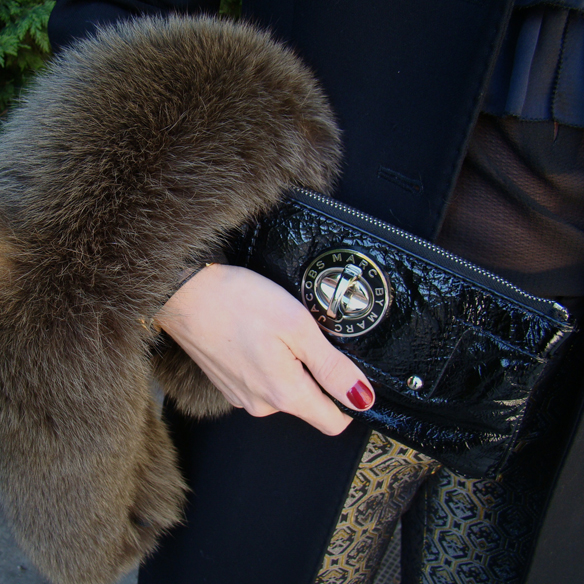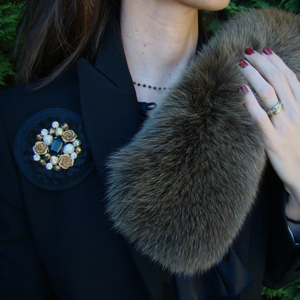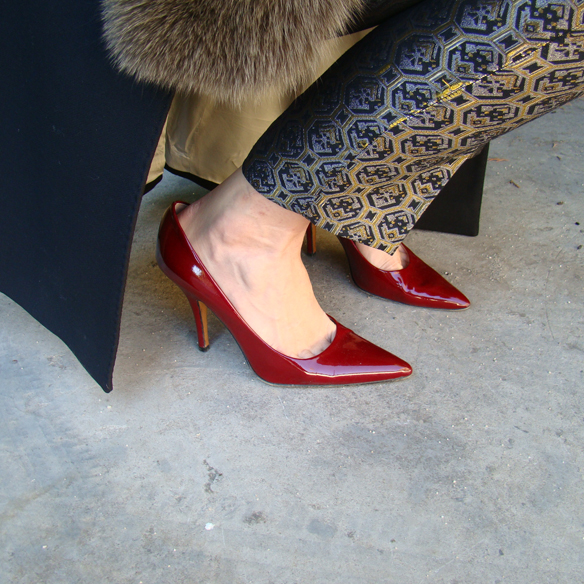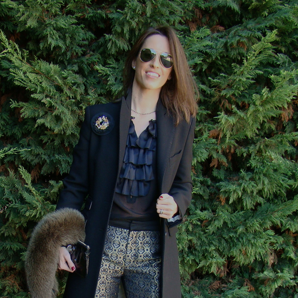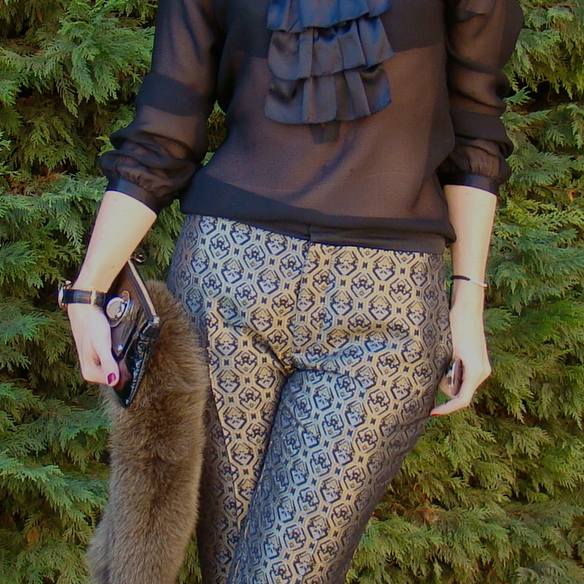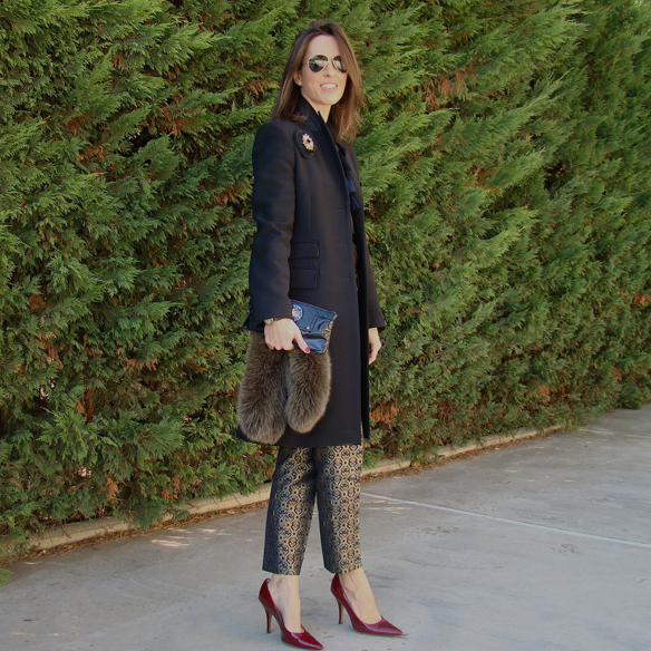 Gold is a very elegant, brilliant and versatile color. It has a lot of matching possibilities and is suitable for day and night. I have chosen a gold day outfit for a family Christmas lunch and my look combines a brocade trouser with a semi-transparent chiffon shirt, with silk details. I also wear a classic black coat combined with a very baroque brooch, a sophisticated fur stole and a small black leather purse. As a special Christmas detail I have chosen a pair of burgundy stilettos and a same color nail polish. I hope you like the ouftit and… Keep calm and carry gold!
