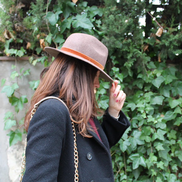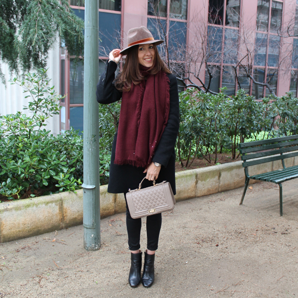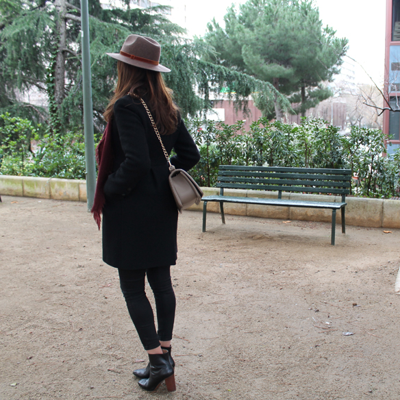 Y es que con buenos básicos en tu fondo de armario el éxito está asegurado. Por eso hoy me decidí por un total black look: un buen abrigo, pantalones pitillo, un amplio jersey de mangas murciélago y botines. Y el toque de color, en este caso lo logro con los accesorios: del burdeos del foulard, al tierra del sombrero y el tostado del bolso. ¡Lista para un frío día de invierno!