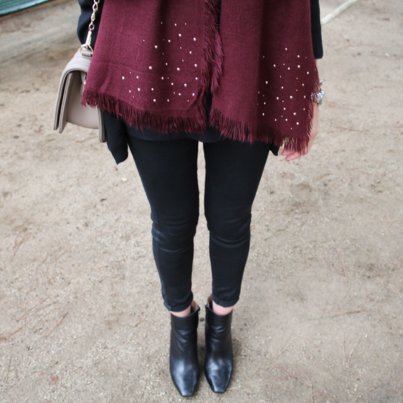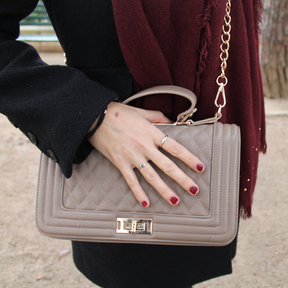 With good basics in your closet success is assured. So today I decided on a total black look: a warm coat, skinny jeans, wide bat sleeves sweater and booties. And the touch of color, in this case its acheived with the accessories: the burgundy foulard, the brown hat and the beige bag. Ready for a cold Winter day!