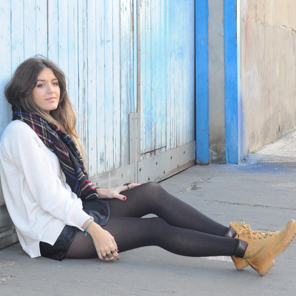 En moltes ocasions els complements defineixen el look, i el d’avui és un bon exemple. A uns bàsics com la faldilla negra i el jersei blanc trencat li afegeixes un gorro de la mateixa tonalitat que aquest últim, un mocador XL tartan, bossa amb animal print, anells en excés, collaret amb doble color blanc i bordeus com l’esmalt de les ungles i ulleres amb muntura rodona per les estones de sol. Obtens un outfit amb un mix d’estampats i textures amb el cuir, el lleopard i els quadres escocesos… Us agrada?
