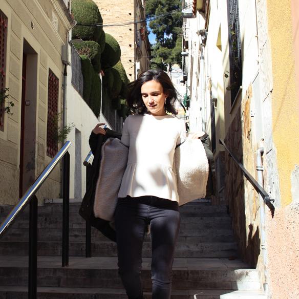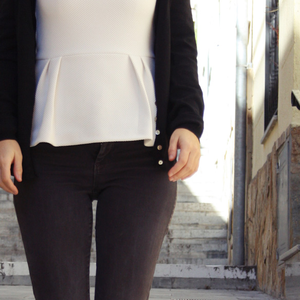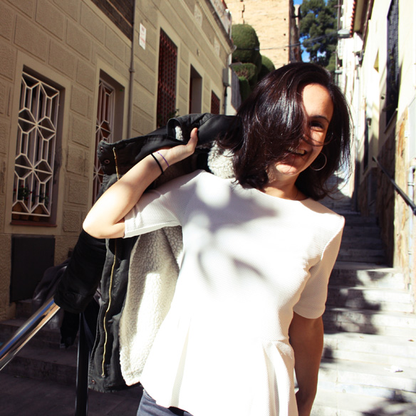 Avui és un post una mica diferent. Per totes aquelles que generalment els agradi vestir més sport i casual, proposo un toc de creativitat. No és perquè sigui un dia especial, sinó perquè m’agradaria explicar que només amb una peça de roba es pot canviar tot el look. Normalment, l’abric verd, que ja us he presentat alguna altra vegada perquè m’encanta, els pantalons pitillo i els botins els porto amb samarretes que segueixen la línia del outfit, essent més sport. Hi vaig còmode i em sento molt bé amb mi mateixa. Però avui m’agradaria presentar-vos aquest top peplum de piqué blanc i de màniga ¾ que, al meu entendre, ho canvia tot. Segueix essent un look sport, que és com més còmode em sento, i al cap i a la fi és d’això del que es tracta, però amb un toc chic. Aquest és un top que generalment em posava en ocasions més especials, però com s’ha pogut demostrar avui, pot ser un look còmode i elegant alhora.
