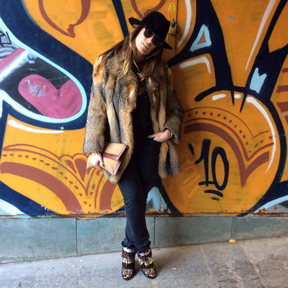 Last week the 080 Barcelona Fashion was held. I attended several fashion shows and this is one of the outfits I chose for the occasion. As some of you know it was freezing cold in the place and you know, forewarned woman counts for two! True to my style I could not miss my black hat that besides having my head warm I love the combination with my fox fur coat that for me is a must this season, furs are very trendy this year. The two pieces were perfect for the occasion and I was warm and comfortable. I wanted to combine it with a basic look based on black: American Vintage t-shirt that never fails and a good skinny.
