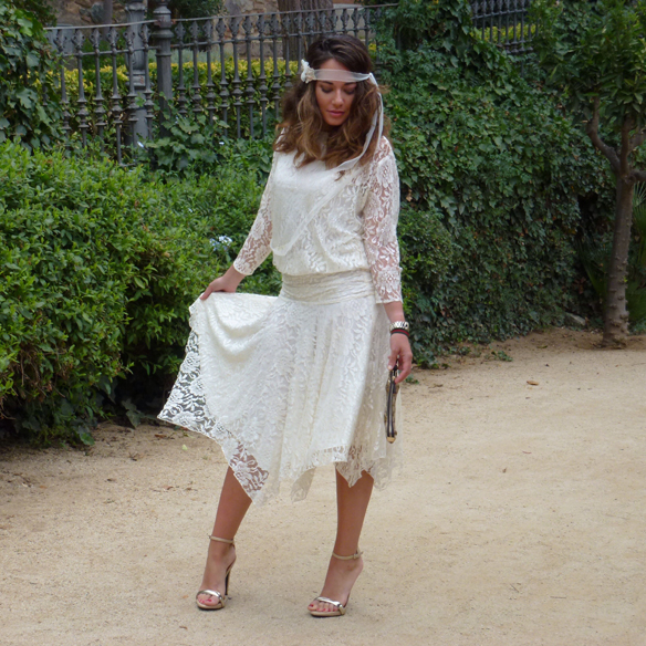 And immediately came to my mind the magical and exquisite pieces of the vintage store L’Arca de l’Àvia. Carmina Pairet was the expert that advise me and I finally decided on a white lace dress with hip drap and batwing sleeves. Complementing the dress Carmina gave me a hair band with a rhinestones tulle flower (a hippie touch). The other accessories that completed the look were gold sandals and a handbag in brown tones that had a gold piece hanging. A natural makeup on my skin that was the star, thanks to Nacho Lugo’s advice with my Inglot custom palette. I hope you all have a happy Saint John’s Eve!