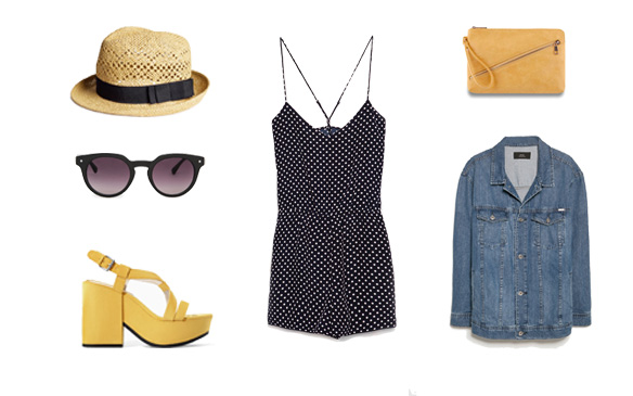 Con este primer outfit os animamos a escoger el mono como aliado del verano, es una prenda fresca, cómoda y femenina. Este especialmente nos encanta de topos en B&W muy lady. Para darle color los complementos son perfectos: bolso de mano y sandalias bloque en amarillo. En la cabeza un sombrerito, gafas de sol redondas y por si hace fresco una cazadora tejana oversize.