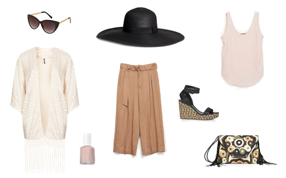 The first look is thought for those wanted Saturdays where we just go out on the morning and don’t return until evening, to walk, eat on a terrace, grab a mojito and finish with a little dinner on the candle lights… A multi-use outfit suitable for all these plans: caramel color culottes, a length of bermudas that will be a strong trend coming next season, with a nude color kimono and top, esparto wedges, cat eye sunglasses, a pamela for the moments of sun, and a raffia pochette in all shades of the outfit. Ideal to enjoy Saturday.