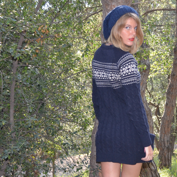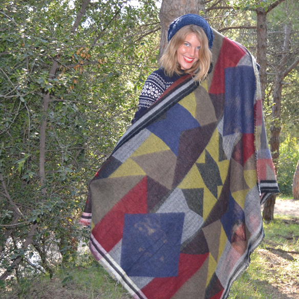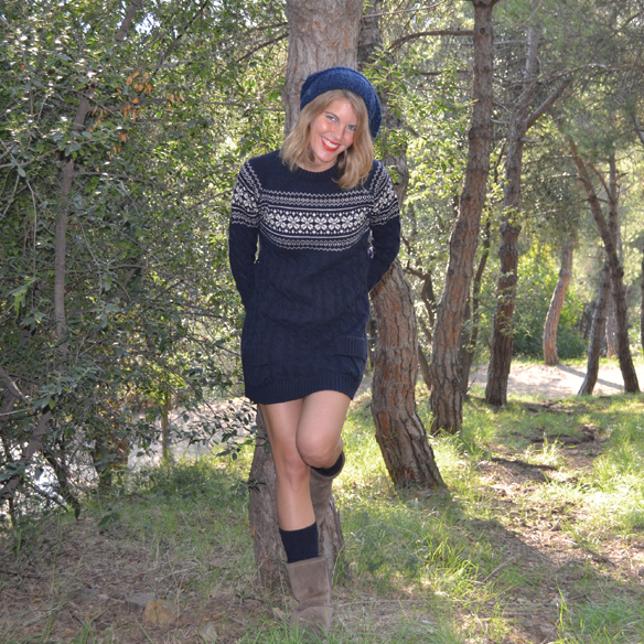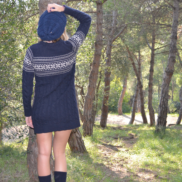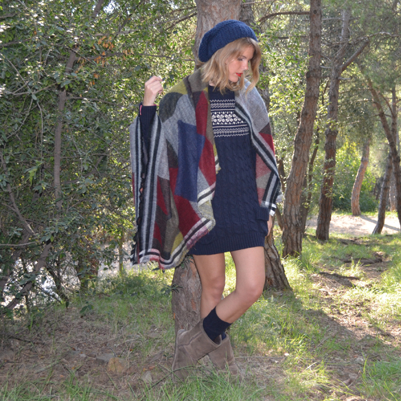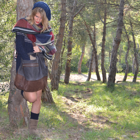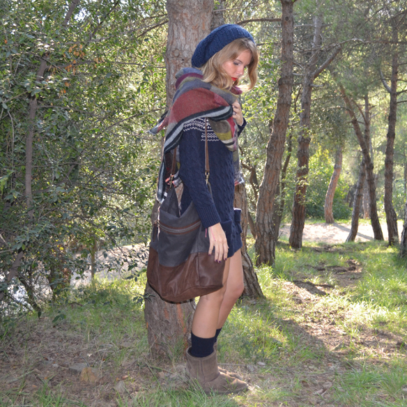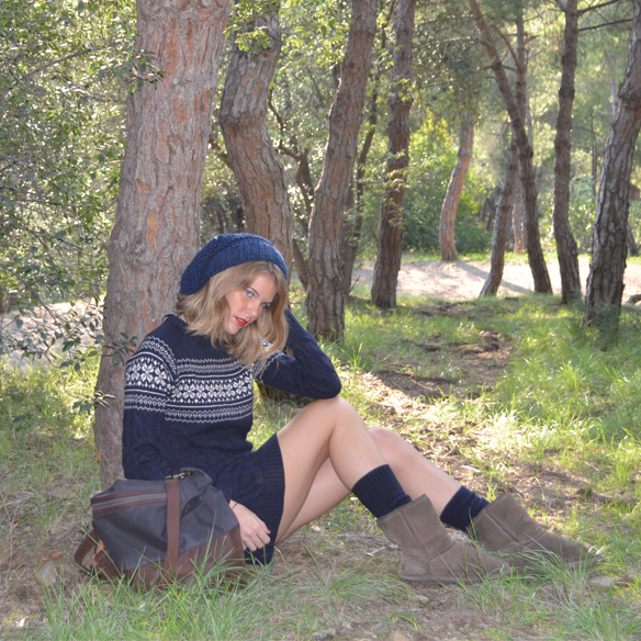 I wear a maxi jumper with typical mountain print of when we were little, combined with another must-have of the season, a blanket as a poncho or pashmina. Some cozy with fat woolen socks to feel warm, with the same color scheme as the bag that I have chosen from my Georgina Carreras Barcelona collection. And last but not least, a wool cap, which gives a touch of grace and closes the styling. All the look in blue tones. Do you like the alpine trend?
