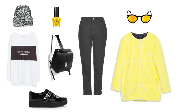 On Sunday we give a touch of madness to a sober outfit in B&W. Is there anything better than a cozy coat for Winter? Yes, of a strident color to give fun to your looks and tramsmit joy; in this case we opted for yellow. Mom jeans in black, a cotton shirt with a message, wear it inside to mark the waist, and black bluchers. To finish the look a bicolor beret, sunglasses with yellow lenses and nail polish of the same color. Happy crazy Sunday!