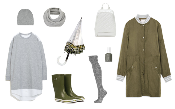 Es por eso que hoy os traemos el look del sábado pensado para un día de lluvia. Combinamos una maxi vestido de dos superposiciones -de camisa blanca y sudadera gris de felpa-, para ir calentitas. Le sumamos una parka de estilo bomber en verde caqui con detalles en gris y blanco como el vestido. Imprescindibles las botas de agua, en este caso de la misma tonalidad, y un buen paraguas para no mojarnos, lo hemos escogido transparente porque es la versión más trendy de este complemento para días lluviosos, con detalles a cuadros de la misma tonalidad del look. Como complementos calcetines largos, bufanda y gorro de lana en gris, y una mochilita blanca. Por último, el esmalte de uñas no podía ser otro que el mismo de las botas y la parka, caqui. Es un look que, por tonalidad, acompaña a la luz de un día pasado por agua, así que nos camuflamos con el tiempo y disfrutamos del sábado ¡saltando charcos!