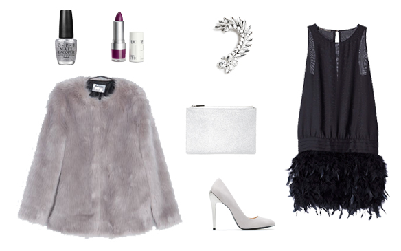 Otra opción es vivir la última y primera noche del año en plata. Un vestido negro con mini en plumas, con unos stilettos de tacón plateado y un bolso sobre de la misma tonalidad. Es un look “menos es mas”, por eso el único complemento del look es el ear cuff en piedras plateadas. Para rematar el outfit el abrigo de pelo gris y la manicura del mismo tono que manda el look. Por último unos labios en berenjena para darle un toque sexy al conjunto. ¡Y a disfrutar y dar la bienvenida al 2015 brillando en plata!