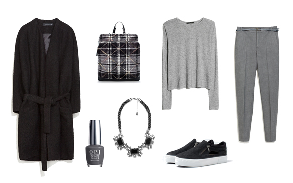 For Saturday we opted for a sporty chic look, a key trend this season. We got it mixing different style garments like these ankle tomboy pants with grey suit stripes, matched with a basic shirt. Following the greys we add the trainers, another element that gives a nod to the sporty and a wool coat. Finally the chosen accessories are a checkered backpack and a necklace of stones that provide a chic, plus the grey manicure. Ready for a shopping Saturday?
