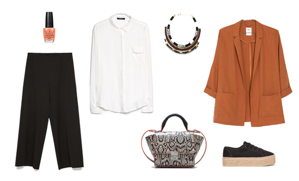 For Saturday we focus on some black cropped pants, a perfect measure for halftime, and we match them with a basic white shirt tucked in to mark more the figure and a fluid tile color blazer, yes, we start to fancy warm colors. To finish off the look esparto trainers and as accessory an ethnic style necklace. Finally an animal print mini handbag and the manicure of the same color as the blazer. A comfy and simple look, yet stylish, to enjoy Saturday.
