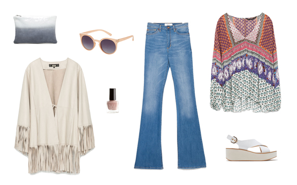 En cambio, queremos disfrutar del domingo con un aire mas setentero y boho. Combinamos unos pantalones acampanados con una blusa en ethnic print que le da todo el color al outfit. Para complementar el look escogemos colores soft: un bolso de mano degradado, esmalte y gafas de sol en nude, y las sandalias en blanco y madera, ¡primer día que dejamos los pies al aire! Por último, pero no menos importante, esta chaqueta de ante con flecos, que junto con la blusa, forman el mejor tándem. ¡Feliz domingo!