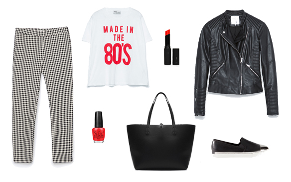Para el sábado nos decidimos por un look que rock, unos tobilleros de tiro alto en cuadro Vichy, con una camiseta por dentro blanca con un mensaje “muy ochentero” en rojo. El red también adquiere protagonismo gracias al esmalte y los lips, un toque sexy para el look. Para los momentos de más fresquito una biker y por último a los pies unas trainers sencillas en negro con puntera de metal, añadiéndole ese rock al look, y un maxi bolso del mismo color. Are you ready?