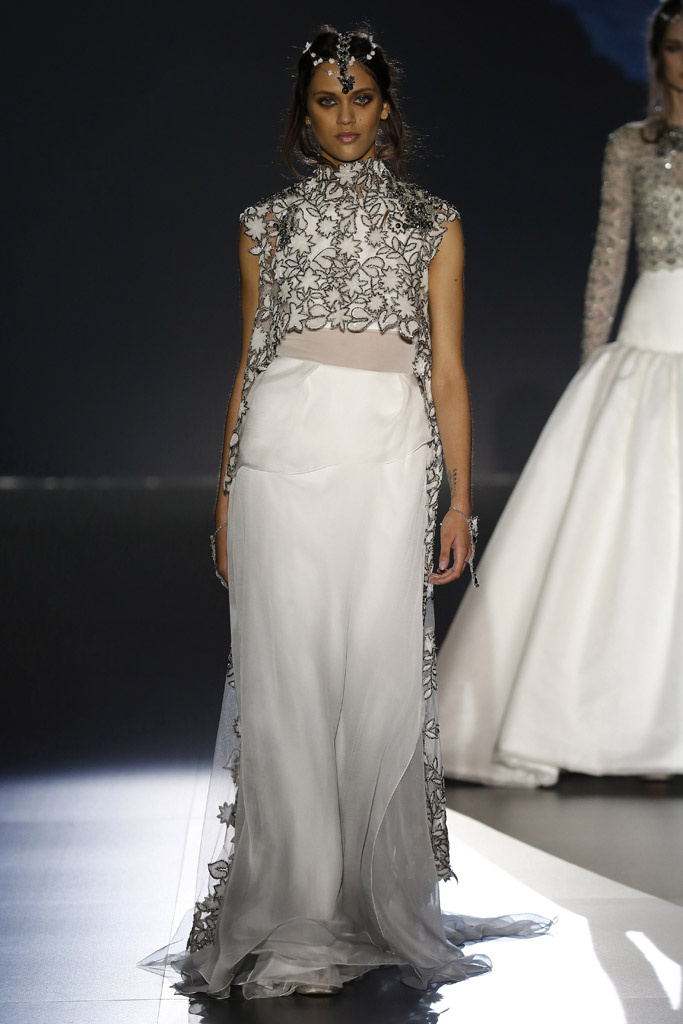 Como cada año, la firma Jesús Peiró, con Merche Segarra al frente, nos trae su trabajadísima y delicada visión de la moda nupcial, y este año inspirándose en unas princesas hindúes, que de camino al santuario del Nanda Devi -montaña de la Diosa de la felicidad que se encuentra entre la India y Nepal-, dejan sobre la pasarela un rastro de escarcha helada o del color del sol al atardecer, que se desprende de los cristales, lentejuelas e incrustaciones joya de sus vestidos. Unas princesas de las nieves que dejaron al front row estupefacto.