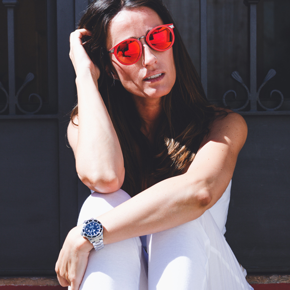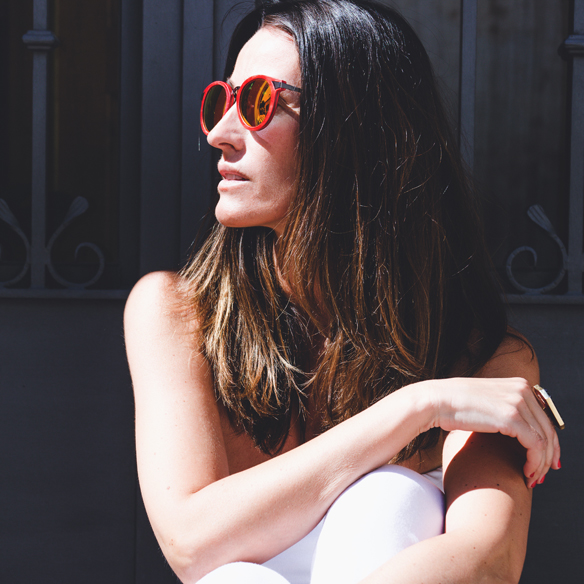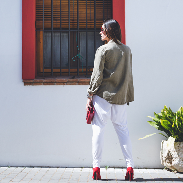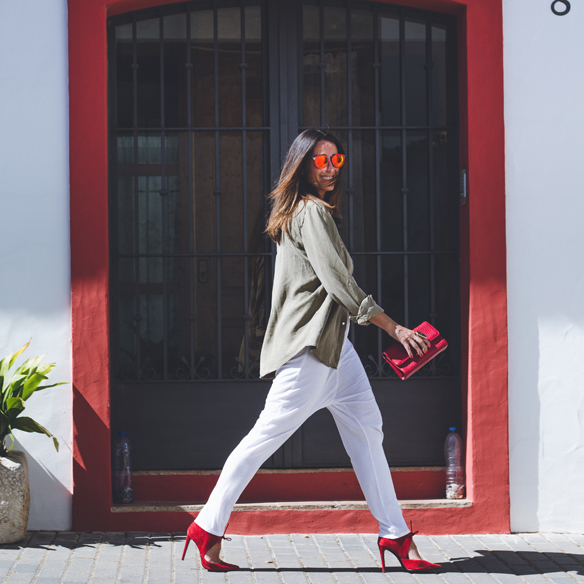 So as you can imagine we celebrate it a lot. I recognize that now quieter with the kids, hence my outfit today. A very comfortable combination and simultaneously with a sexy touch. In a Mónica Lendinez’s white strapless jumpsuit with gold gradient, matched with a military-style shirt with gold antiqued fixtures, and to give a touch of joy my red stilettos.